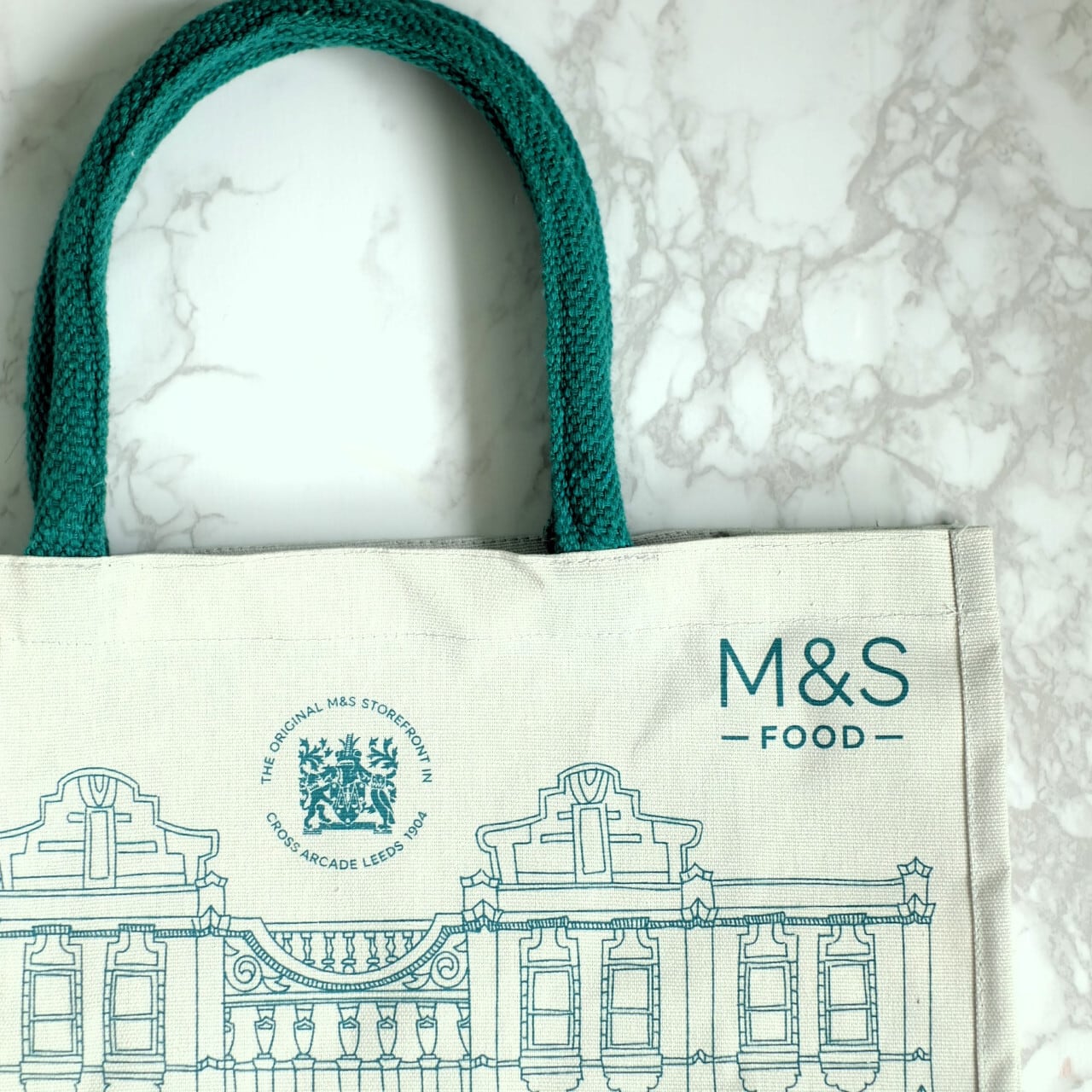 リーズのクロスアーケードにあるオリジナルM&S店舗のイラストをあしらった、おしゃれなコットン製ショッピングバッグ。