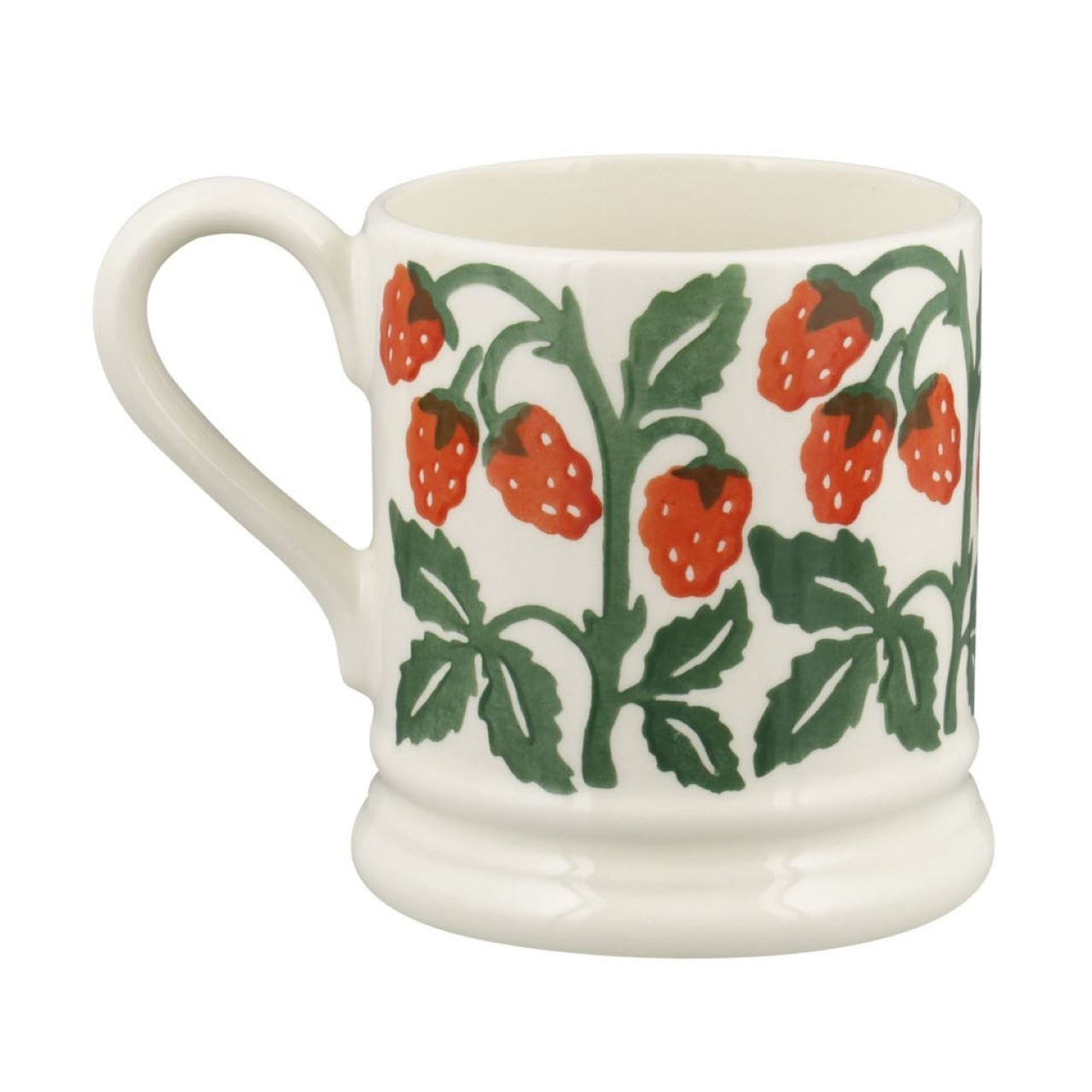 鮮やかな赤いラズベリーと深いグリーンの葉がリズミカルに並ぶ、愛らしいデザイン。エマ・ブリッジウォーターならではのスポンジステンシル技法により生まれる、素朴であたたかな表情が魅力です。イギリスの工房で職人が一つひとつ手作業で仕上げたマグカップは、毎日のティータイムを明るく彩ってくれます。